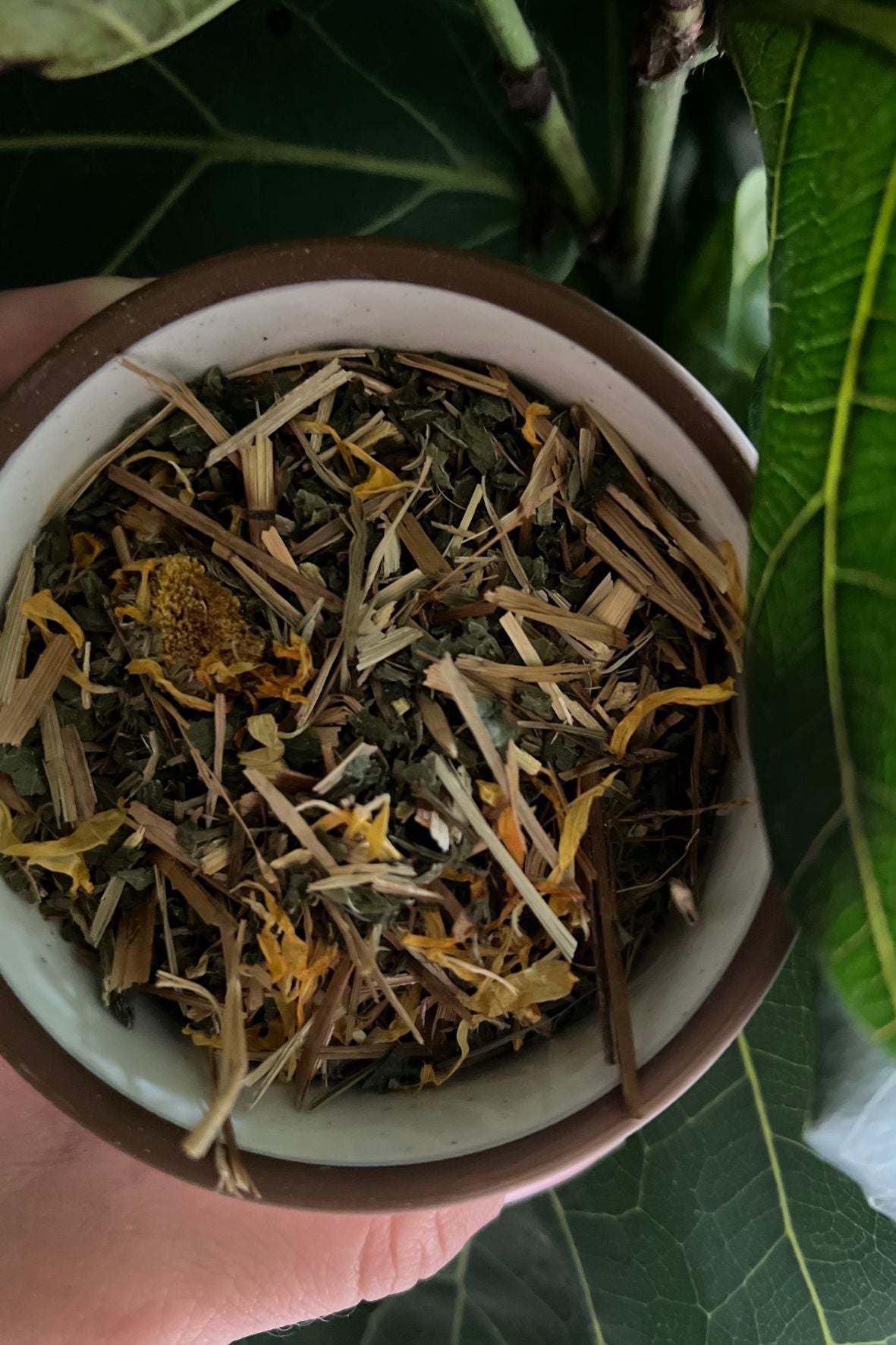 All herbs are organic and sourced from sustainable companies. Oat Straw, Nettle, Peppermint, Spearmint, Licorice Root, Ginger, Ashwagandha